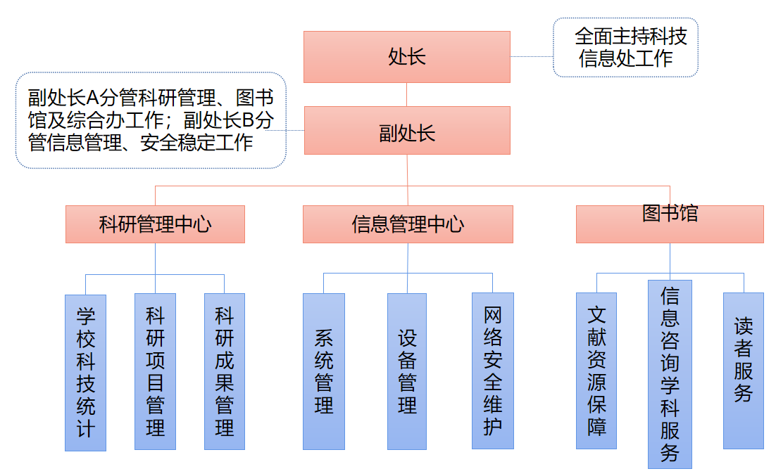 2021年2月学校机构改革,成立楚雄医专科技信息处,承担原科技处、信息中心、图书馆的工作职责,主要负责beat365科学研究管理服务、信息技术管理服务、图书馆的工作。科技信息处现有教职工19 人,其中研究生学历9人。设处长一名,副处长两名,内设科研管理中心、信息管理中心、图书馆、综合办公室,面向全校开展具体业务。